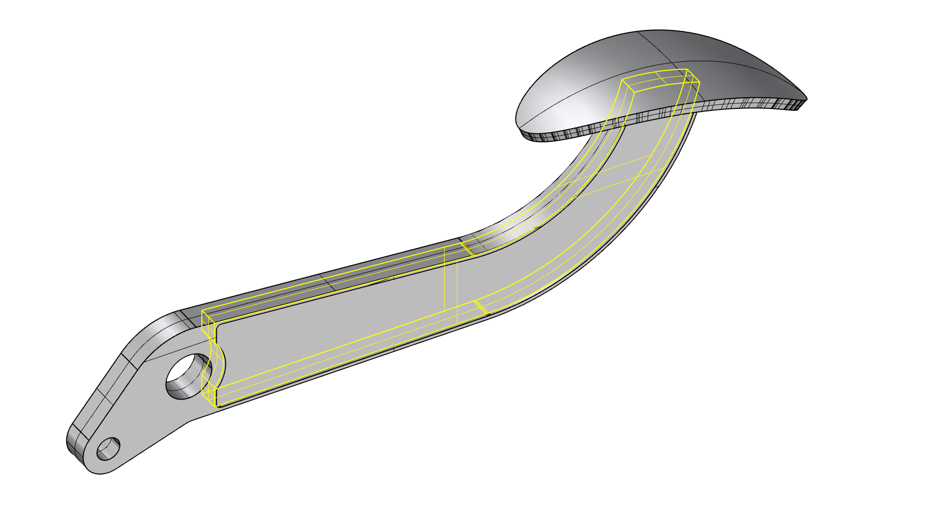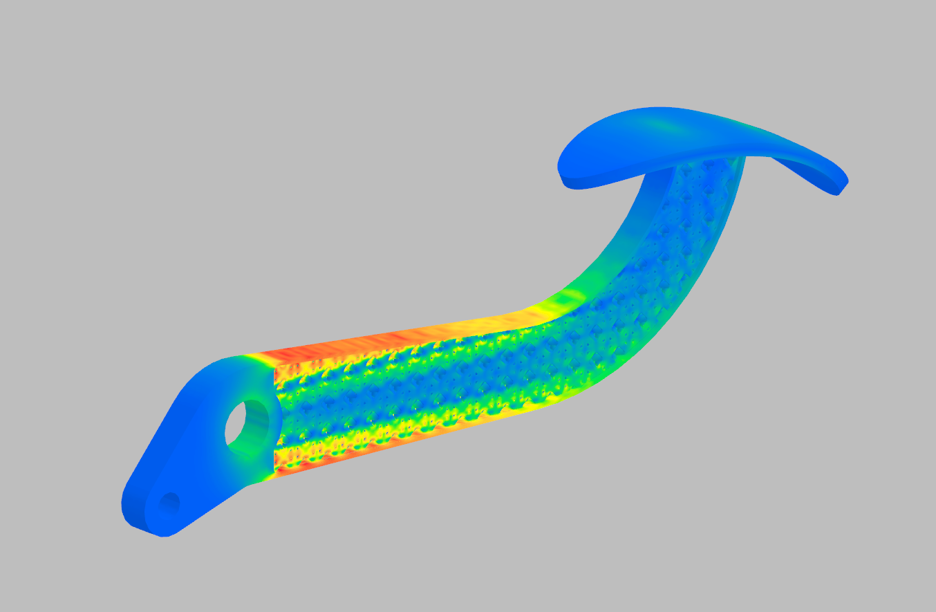 By utilizing the sampler block, values can be found at specific points. Also, the mesh results can be used to calculate volumes which when multiplied by a density can calculate the mass of the pedal. These applications can be seen in the grasshopper file within the zipped folder. When the simulation is run, the results should look something like this: