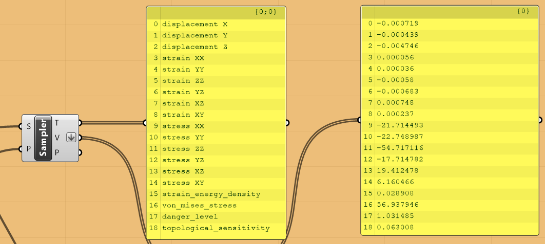 The outputs of the solution sampler are (T) is a list of the solution quantities and its corresponding index. The index corresponds to the values (V). The final output is a list of the points (P) that were sampled.